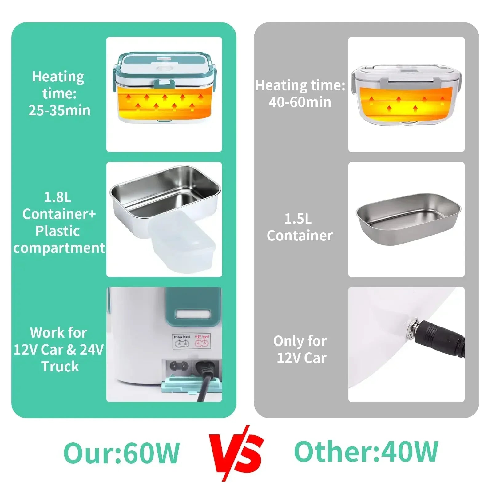 Introducing our 3-in-1 Electric Lunch Box, a convenient solution for those who are always on the go! This versatile lunch box supports 110V/220V for home/office use, 12V for car use, and 24V for truck use. Enjoy hot meals anytime, anywhere. With an upgraded 60W power supply, our electric heating lunch box heats up in just 25-35 minutes. The circulating heat design ensures your food stays nutritious and fresh. Four-sided snaps and a built-in rubber seal make this lunch box leak-proof, eliminating worries about soup leakage. Ideal for office employees, construction workers, truckers, and anyone who prefers homemade meals. The stainless steel container has a generous 1.8L capacity, ensuring you won't go hungry. Additionally, a 0.45L plastic compartment allows you to separate different kinds of food. The included insulation bag protects your lunch box from rain and dust, making it easy to carry. Please note that the electric lunch box should not be submerged in water. If taken from the fridge, extend the heating time accordingly.